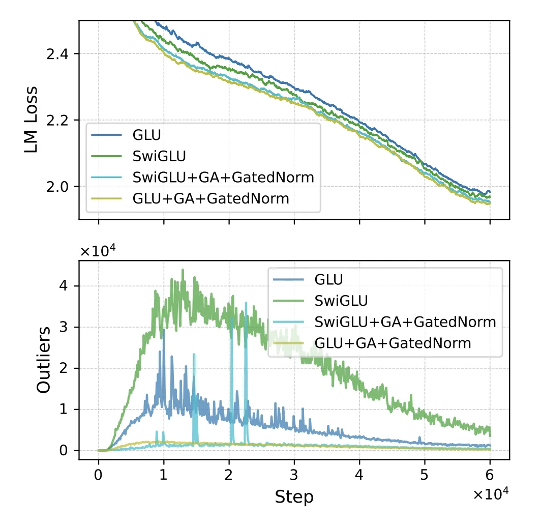 - 使用 GLU + GA + GatedNorm 的时候 要比 SwiGLU + GA + GatedNorm 好,loss更低,outlier也更少