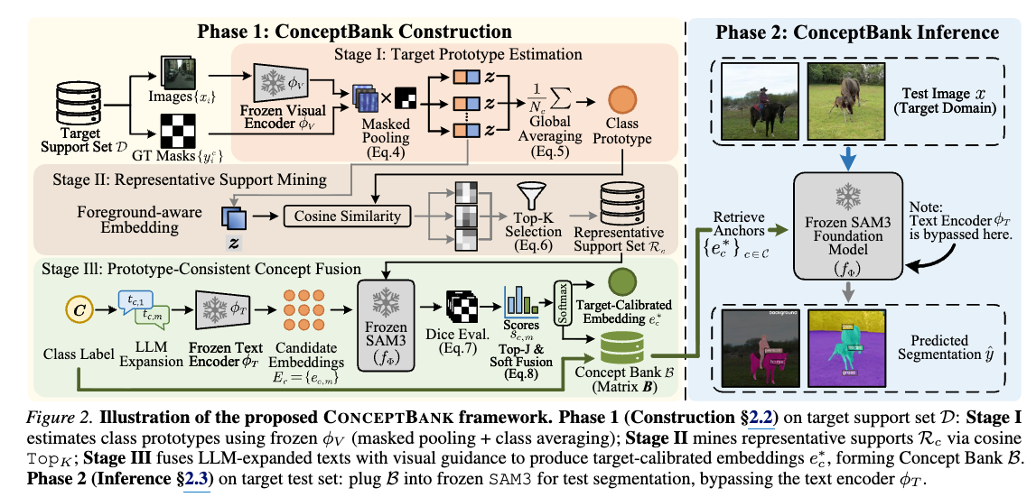 TLDR:针对 SAM3 在跨域推理时因 distribution shift 导致的对齐失效问题,提出了一种无参数的概念库(ConceptBank)校准框架,动态重构目标域的文本锚点以恢复视觉与文本的匹配。结果看上去很不错,同时 这个工作和 https://intellindust-ai-lab.github.io/projects/FSOD-VFM/ 有相似之处。