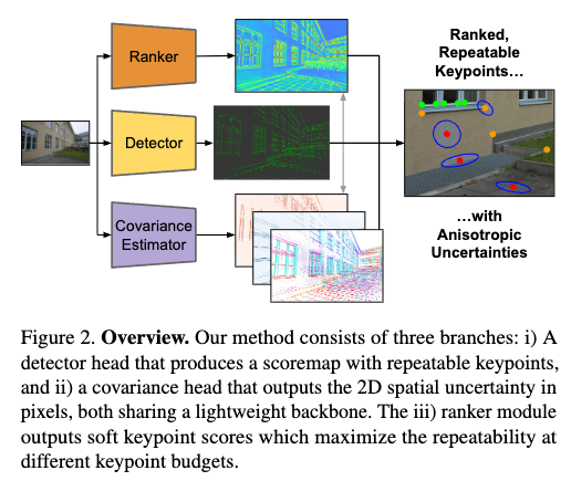 RaCo = a Detector to find repeatable keypoints + a differentiable Ranker to maximize repeatability at smaller keypoint budgets + a Covariance estimator to quantify their spatial uncertainty