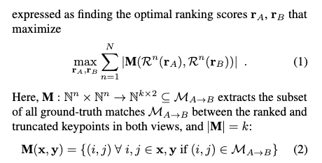 具体来说,就是找到一个很好的排序分数 r 的表示器或排序图 R,让 M 越大越好(其中 n 是 n 个检测到的关键点,k 是 k 个匹配上的点)。但是上面的 M 不可微,所以我们需要学一个排序图 R \in R^{H*W}: h 是一个 ranking operator (n→n),将ranking scores r 转为可微的 r_soft