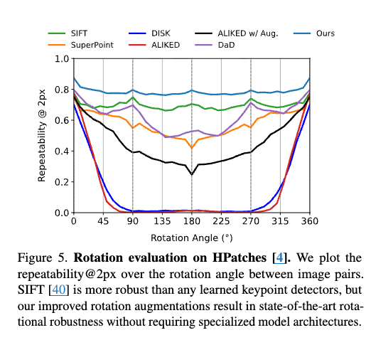 - 旋转鲁棒性来自训练中广泛的数据增强,具体地,训练对是通过合成单应性变换和强光度变换生成,包含完整的 360 度旋转。
