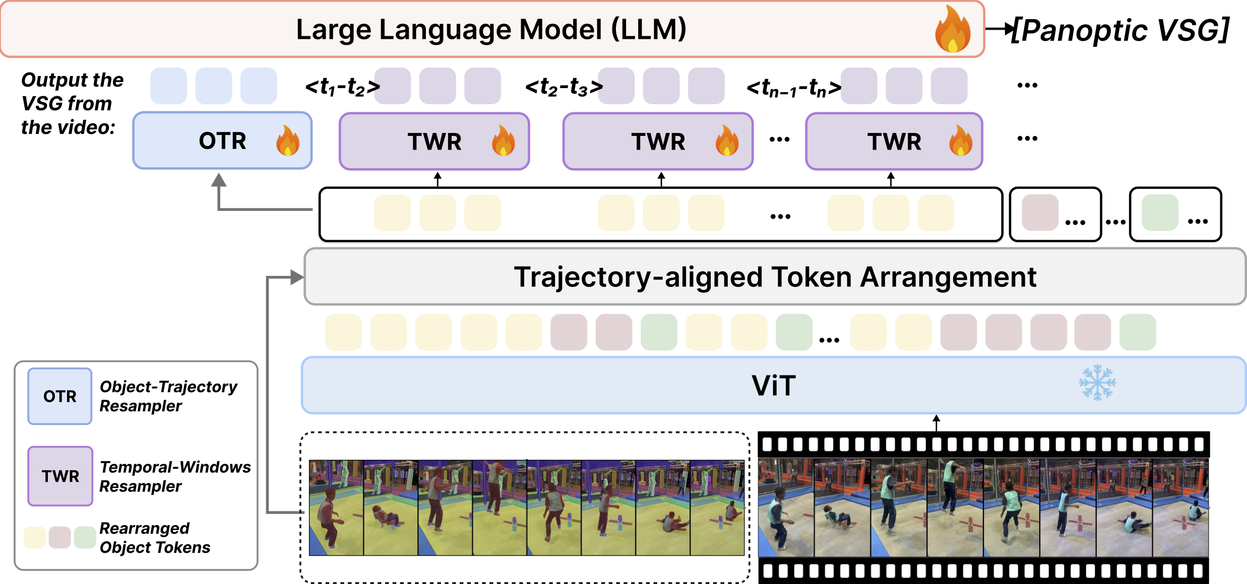 - Trajectory-Aligned Token Arrangement: Binds ViT tokens to object trajectories based on segmentation coverage, producing identity-preserving token streams with explicit trajectory boundaries.