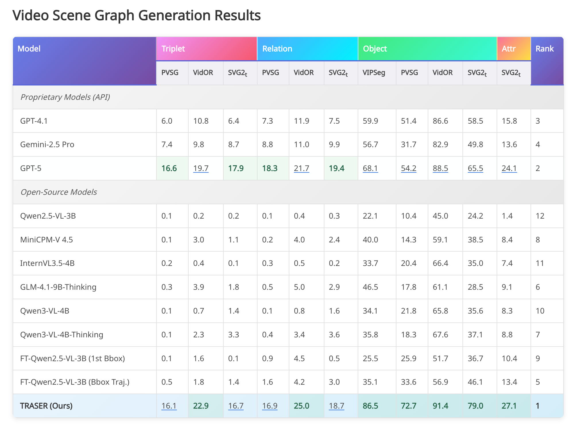 TRASER VLM,通过一次前向传播,从原始视频和全景物体轨迹生成 structured video scene graphs (VSG)