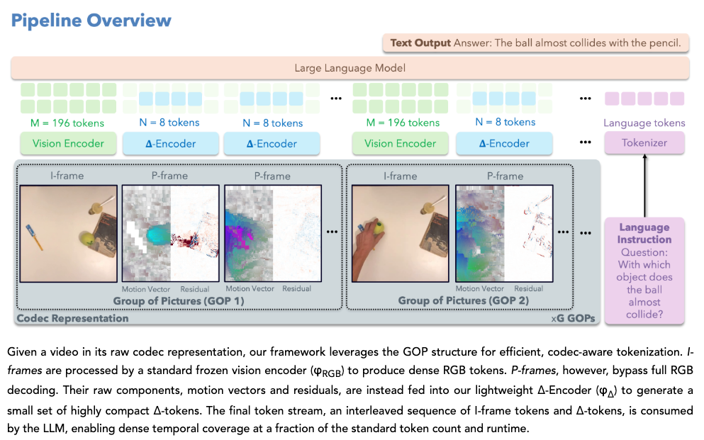模型首先解析视频的图片组(Group of Pictures - GOP)结构。它将视频分为独立的 I 帧(完整图像)和预测性的 P 帧(仅包含变化)。I 帧通过标准的视觉编码器处理,而 P 帧则进入专有的高效通道。