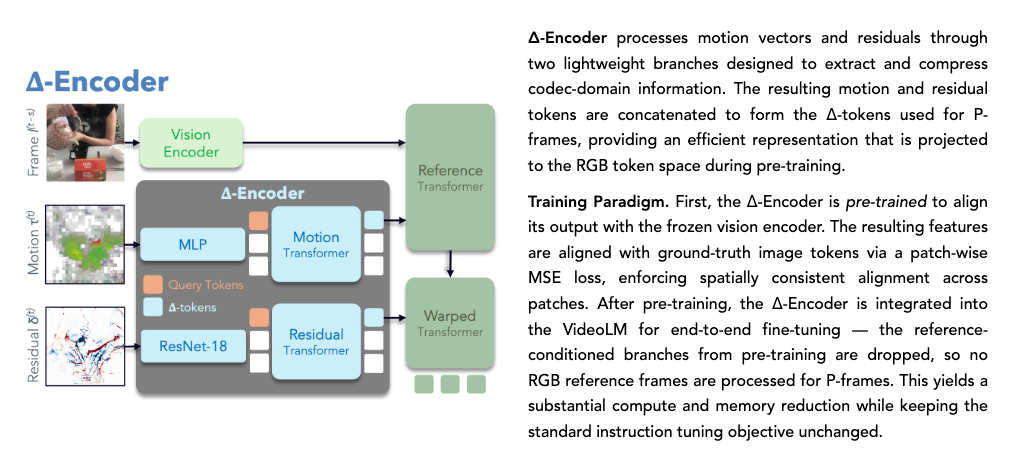 - 预训练阶段:通过模拟视频解码过程,强迫 Δ-tokens 在嵌入空间中与真实的 RGB 图像特征对齐。其核心目标是最小化预测 Token 与真实图像 Token 之间的回归损失(LMSE)。