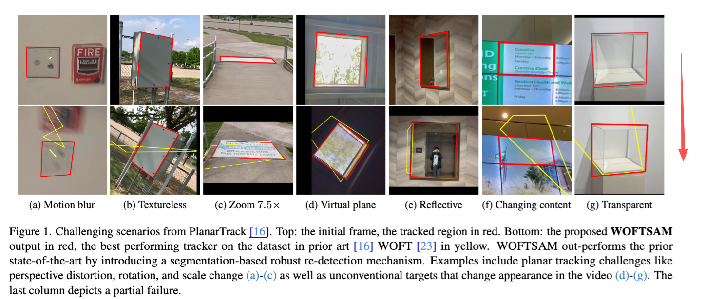 - 动机 / 发现:在过去,平面跟踪高度依赖物体的“纹理”,但是传统平面跟踪在模糊、遮挡和无纹理表面(如镜子)下极易失效。